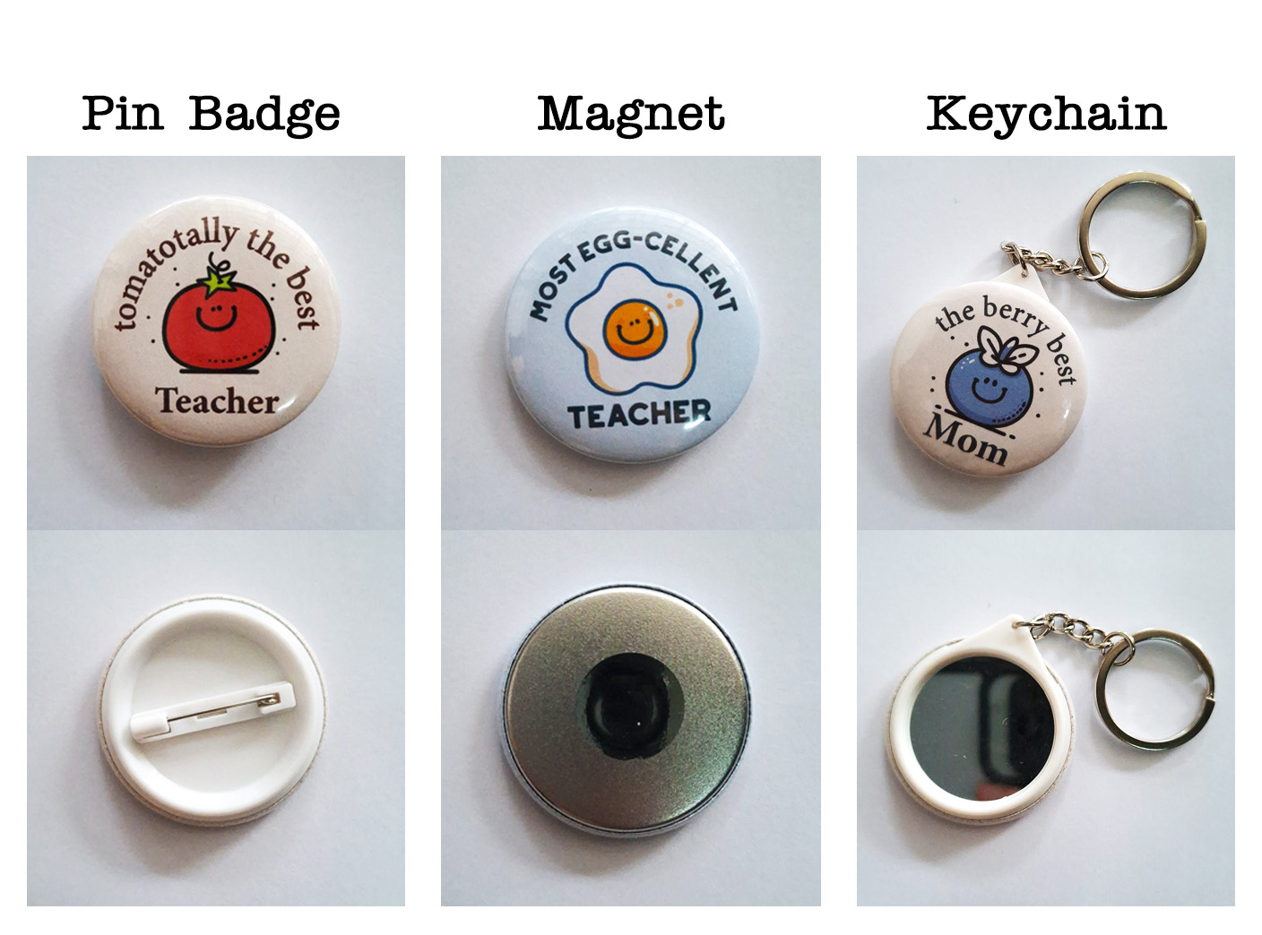 My Sunny Street currently only sells 44mm diameter button badges. All pin badges, magnets, and keychains are the same size. This is how the diameter is measured. 44mm is approximately 1.73 inches.